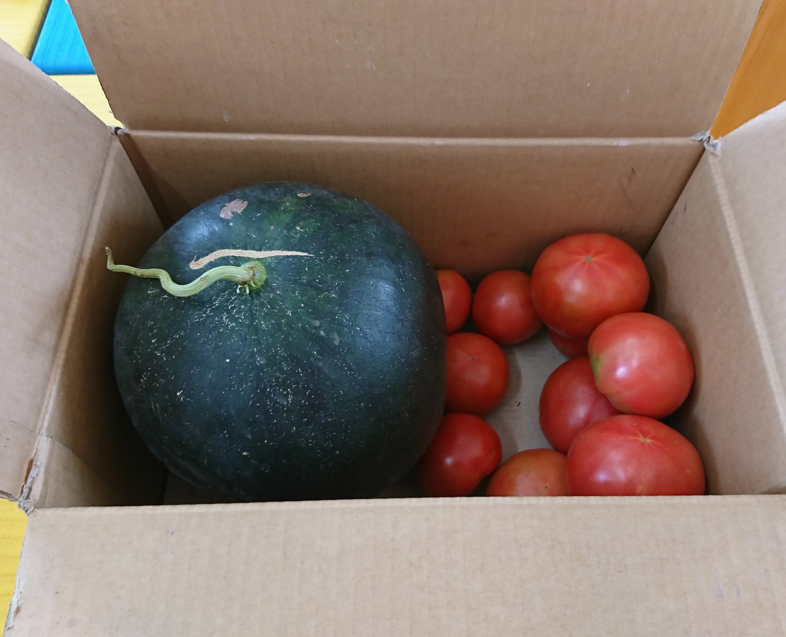 またご近所の野菜作り名人のおばさまに、大きいスイカとたくさんのトマトをいただきました!
