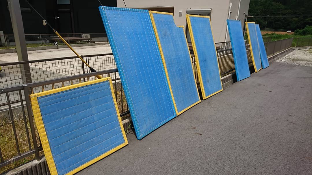 柔道畳を外に天日干しして、