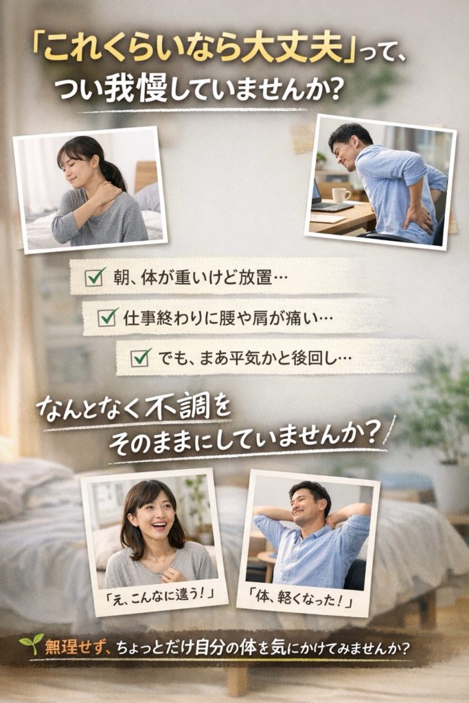 仕事や家事が終わる頃には、腰や肩がじわっとつらい。
