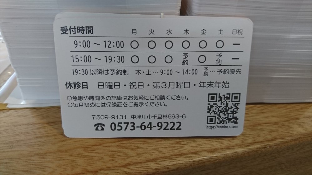 2020年1月10日 / 最終更新日 : 2020年1月10日 daisuke 院長ブログ やっとこさ診察券完成! とんぼ接骨院開業から約1ヶ月。 やっとこさ診察券が出来上がりました! オレンジのカードに白いとんぼ接骨院のロゴがいいですね! FacebookXBlueskyHatenaPocketCopy