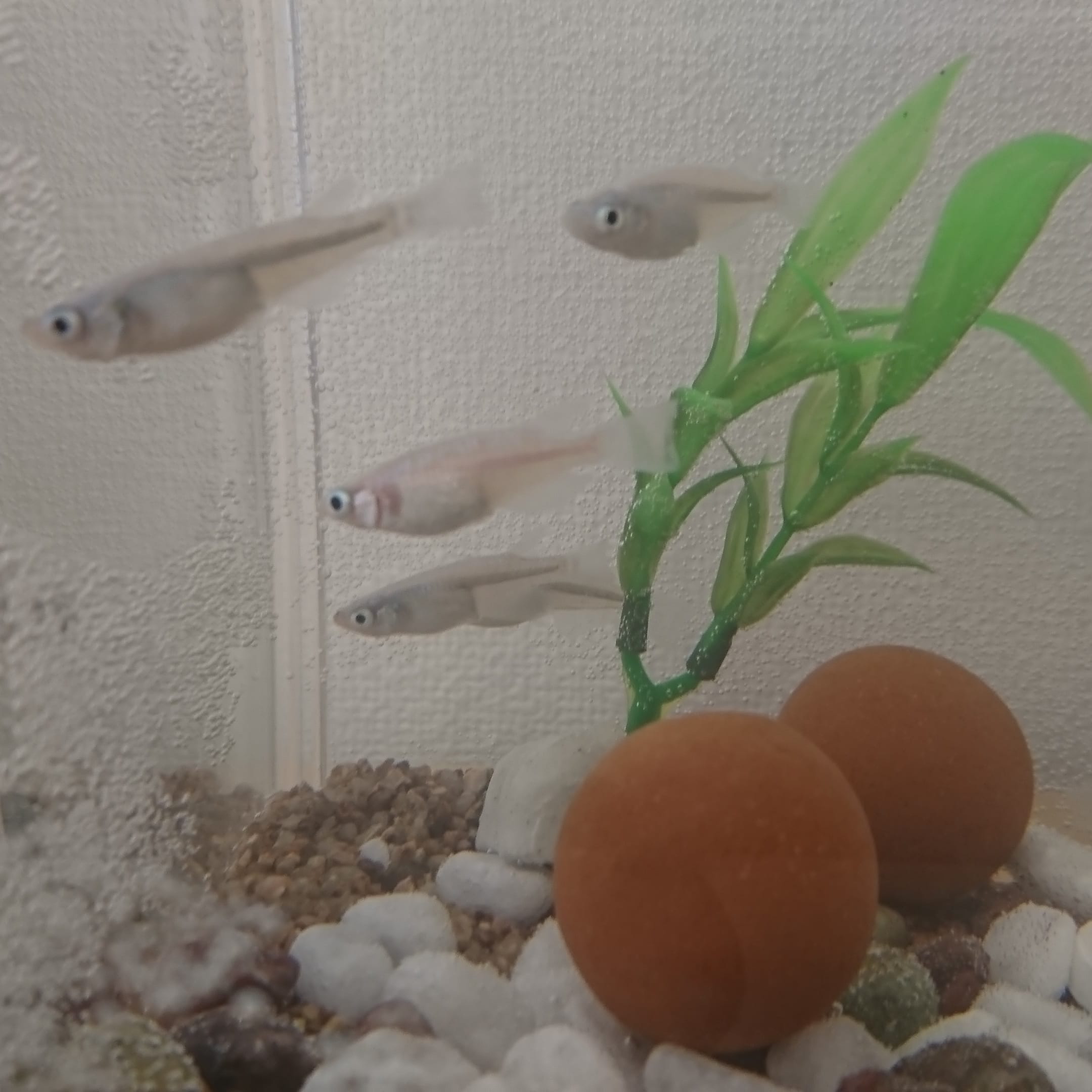 一匹だけピンクのメダカがいるので探してみてください!